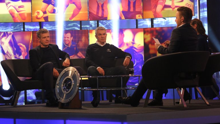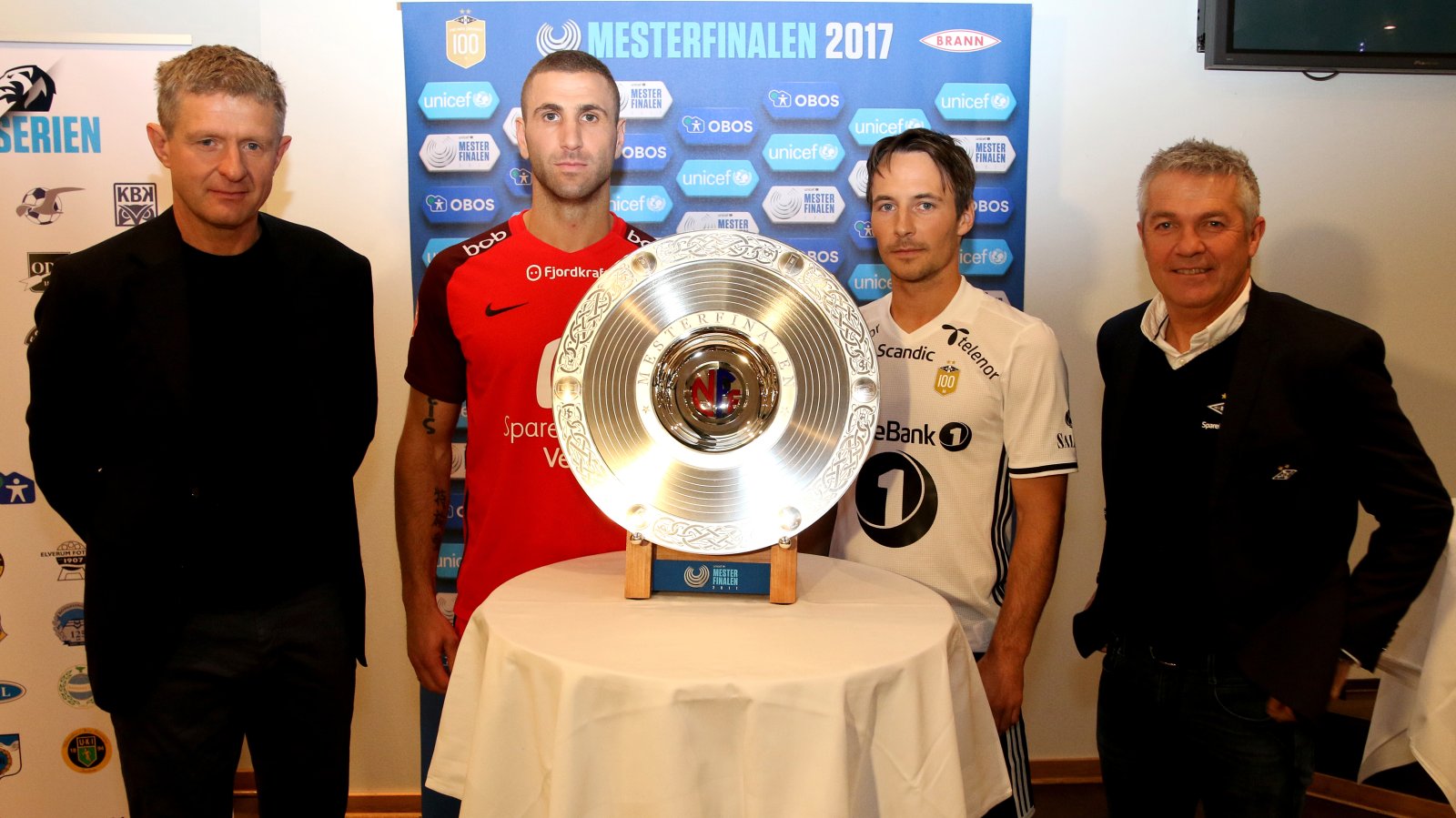 Azar Karadas, Mike Jensen og de to lagenes trenere poserte også med det spesiallagde troféet foran pressekorpset på Ullevaal. Onsdag klokken 19.00 møtes de igjen.